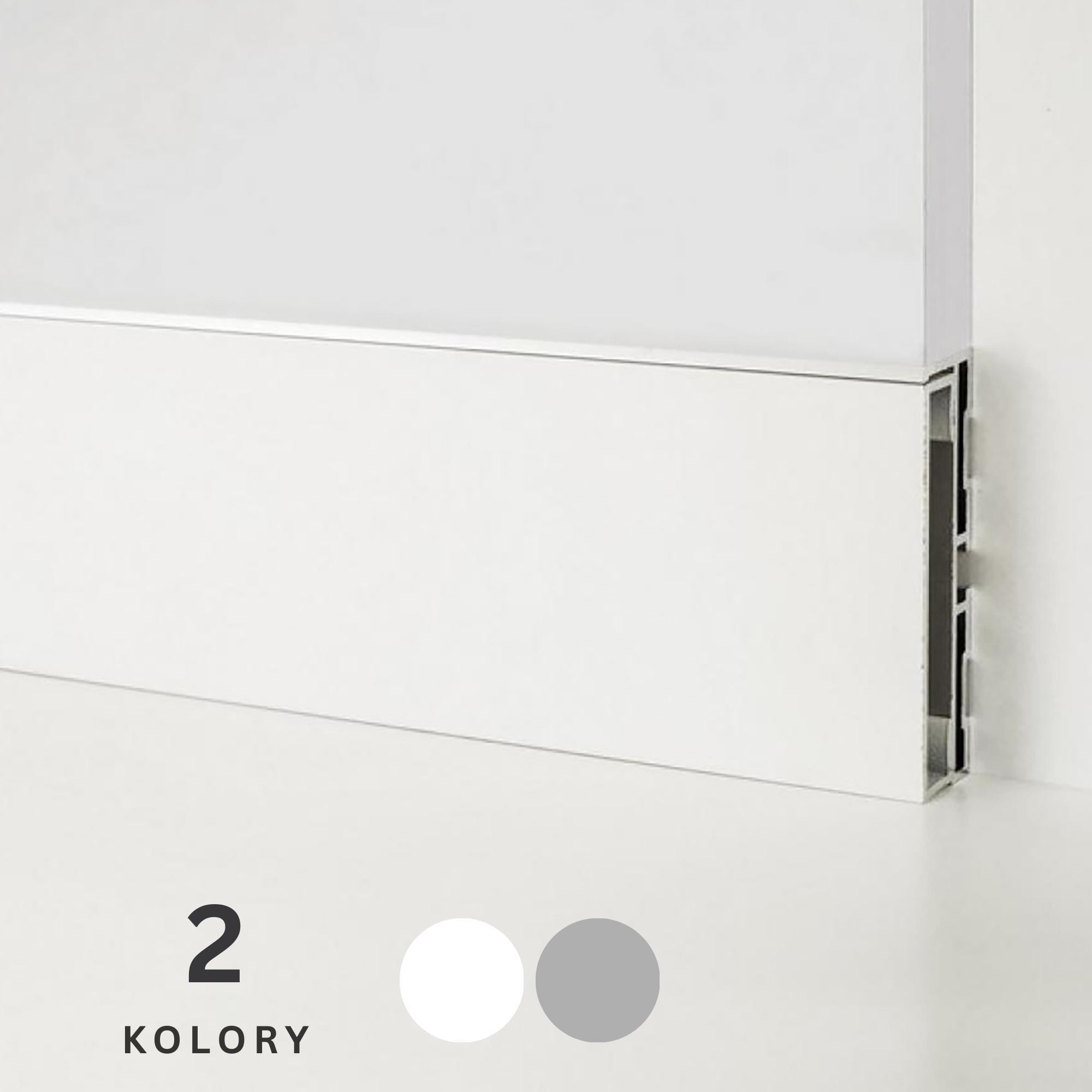 Listwa Metal Line 87-88 zbudowana jest z dwóch elementów: bazowego (wykonanego z aluminium naturalnego) oraz wstawki w kolorze srebrnym lub białym. Do wyboru jest więc listwa srebrna lub biała.