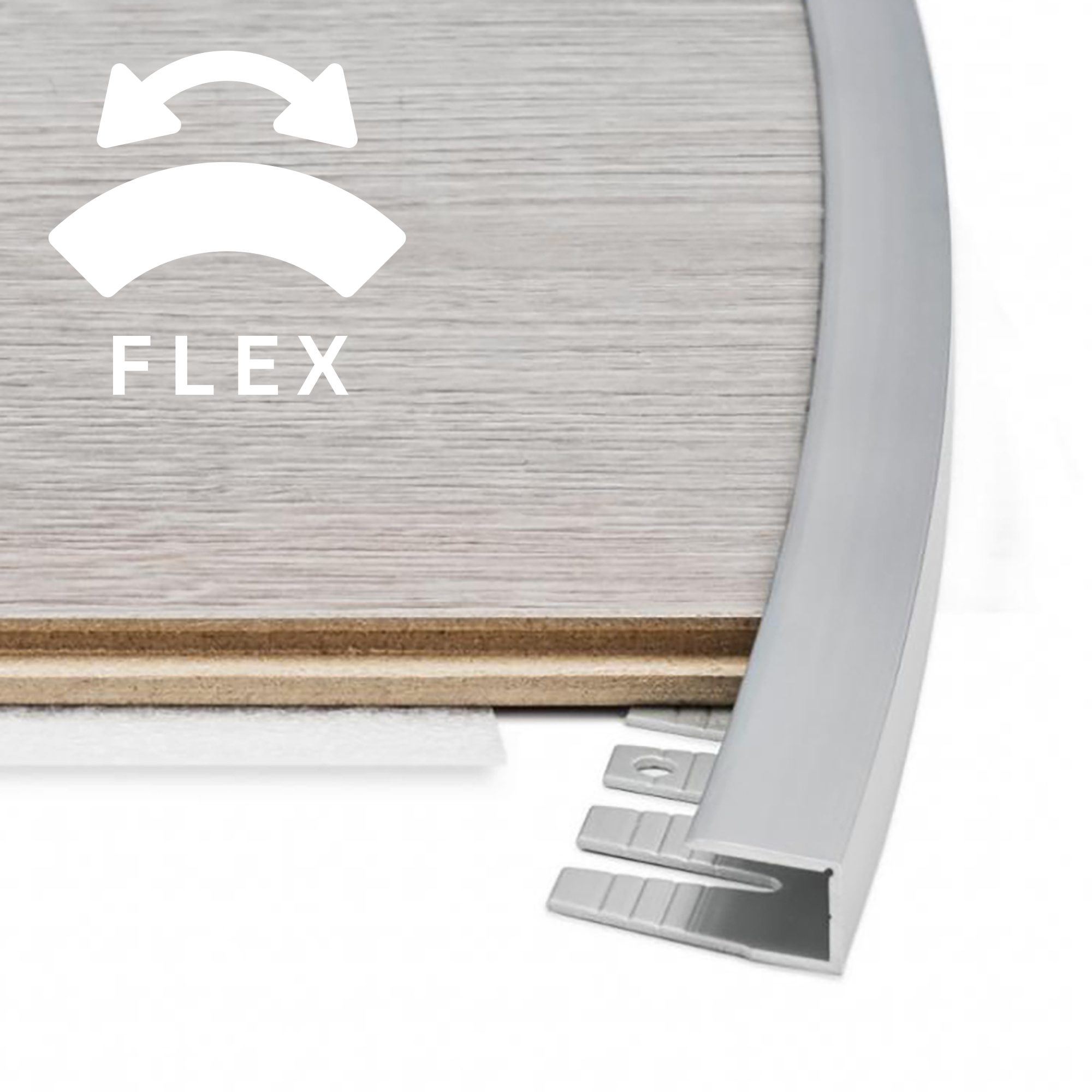TERMINAL FLEX to profil do wyginania z aluminium do układania podłóg z płytek ceramicznych, parkietów, wykładzin, drewna, laminatu, itp., gdzie konieczne jest wykończenie krzywoliniowej krawędzi podłogi. Ten profil zakończeniowy można wyginać z pomocą Proflex Machine lub innej giętarki.